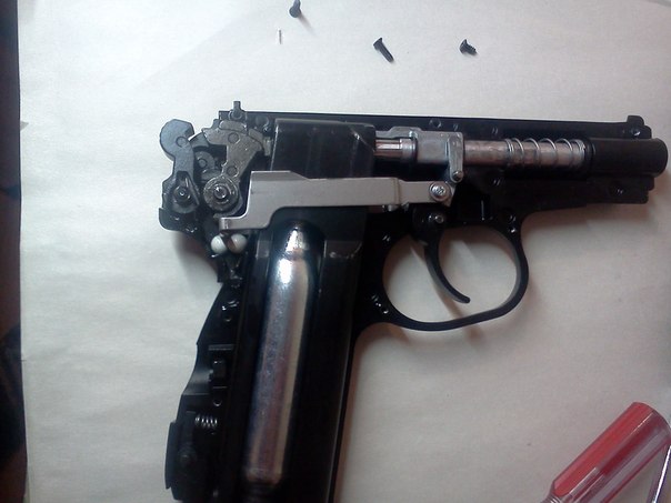 При эксплуатации выявлено, если вытащить обойму не произведя холостого выстрела, может произойти следующее - в стволике (иногда) остается шар или даже несколько (данный дефект вызван конструктивными особенностями и не устраним). Пока обойма находится в рукоятке, она запирает стволик, и при выстреле шар как и положено вылетит, если мы вытаскиваем обойму то шарик может: - остаться в стволике ( тогда при следующем выстреле вылетит 2 шара), так у меня сейчас всегда происходит. - вывалится из стволика и покинуть пистоль через рукоятку. - вывалится из стволика и начать увлекательное путешествие по внутренностям ПМ-А, в результате может произойти заклинивание ударного механизма (на фото шар заблокировал скобу взводящую боек). Решение проблемы - снять пластиковую накладку с рукояти открутив винт шестигранником, далее положить ПМ на ровную поверхность, аккуратно выкрутить крестовой отверткой все семь винтов (винты разные по длине, не перепутайте), Далее, не поднимая пистоль, нежно, не торопясь снять верхнюю часть корпуса (все "потроха" должны остаться в нижней части корпуса), пинцетом вынуть шары, собирать обратно. Магазин при переборке лучше не вытаскивать. Если нежно не получилось, или пришлось перемещать внутренние детали - ниже схема которая поможет правильно собрать ПМ-А. В некоторых случаях, помогает открытие клапана магазина (обоймы), нажимаем через ударный механизм на клапан отверткой, не прибегая к разборке. В целом ПМ-А от Глетчера неплохой пистоль, единственная реальная проблема, не герметичность клапана магазина (возникает, не понятно от чего, брак видимо), но в принципе, лечится, какие-то резинки-уплотнители от пневмосистемы трактора - товарищи подсказали (какого именно пока не знаю, но выясню) подходят (магазин ещё не разбирал, не было необходимости, тьфу-тьфу). "Кетайского" баллона хватает на 6-7 обойм, выхлоп от 120 м/с, но быстро падает, стабилизируется около 100. Последний раз редактировалось Ramza; 17.04.2013 в 21:42. |